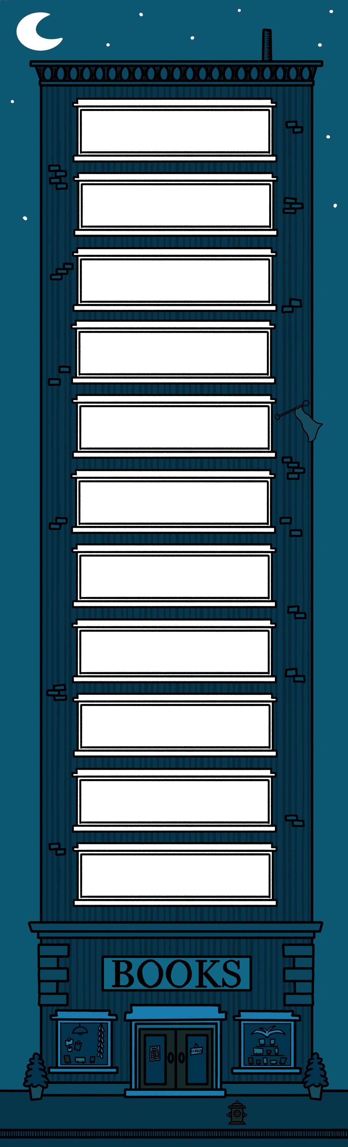 The bookmark needed a back design, so I created a night scene and extended the windows. This way, a reader can log which books the bookmark visited.