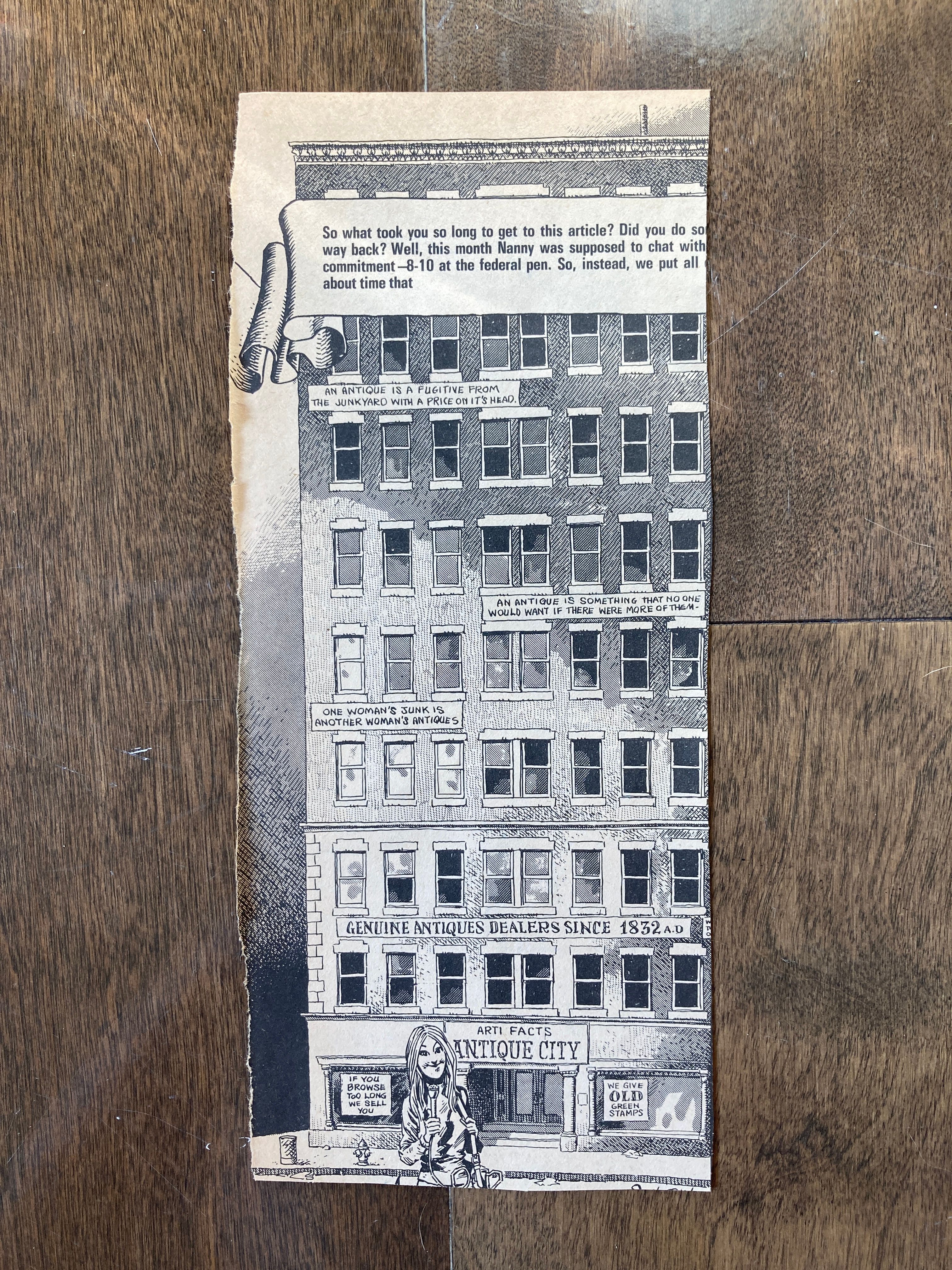 Still, I held onto the drawing, knowing there’d be a day when I’d give it another go. That day came in 2025 when I wanted a bookmark idea for the 2025 Patreon kit. I used my previous drawing for window content fodder, and for the building, I referred to the following John Severin illustration from an old Cracked magazine, as I can be boring when it comes to drawing architecture from my imagination.