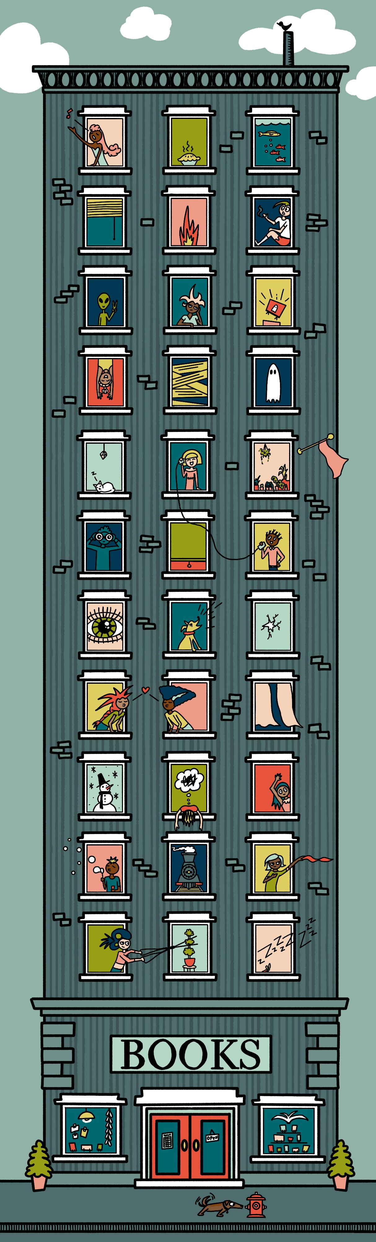This went much more smoothly with the tablet; I could make straight lines and zoom in and out. As a result, you can now actually see what everyone’s doing! I love giving my characters funky hair. Seeing that this was a bookmark, it was appropriate for the storefront to be a bookstore. Some of the scenes in the windows (e.g., an oncoming train, a massive eye) may have been inspired by the Twilight Zone, the cover of Led Zeppelin’s Physical Graffiti, and even an episode of Muppet Babies.